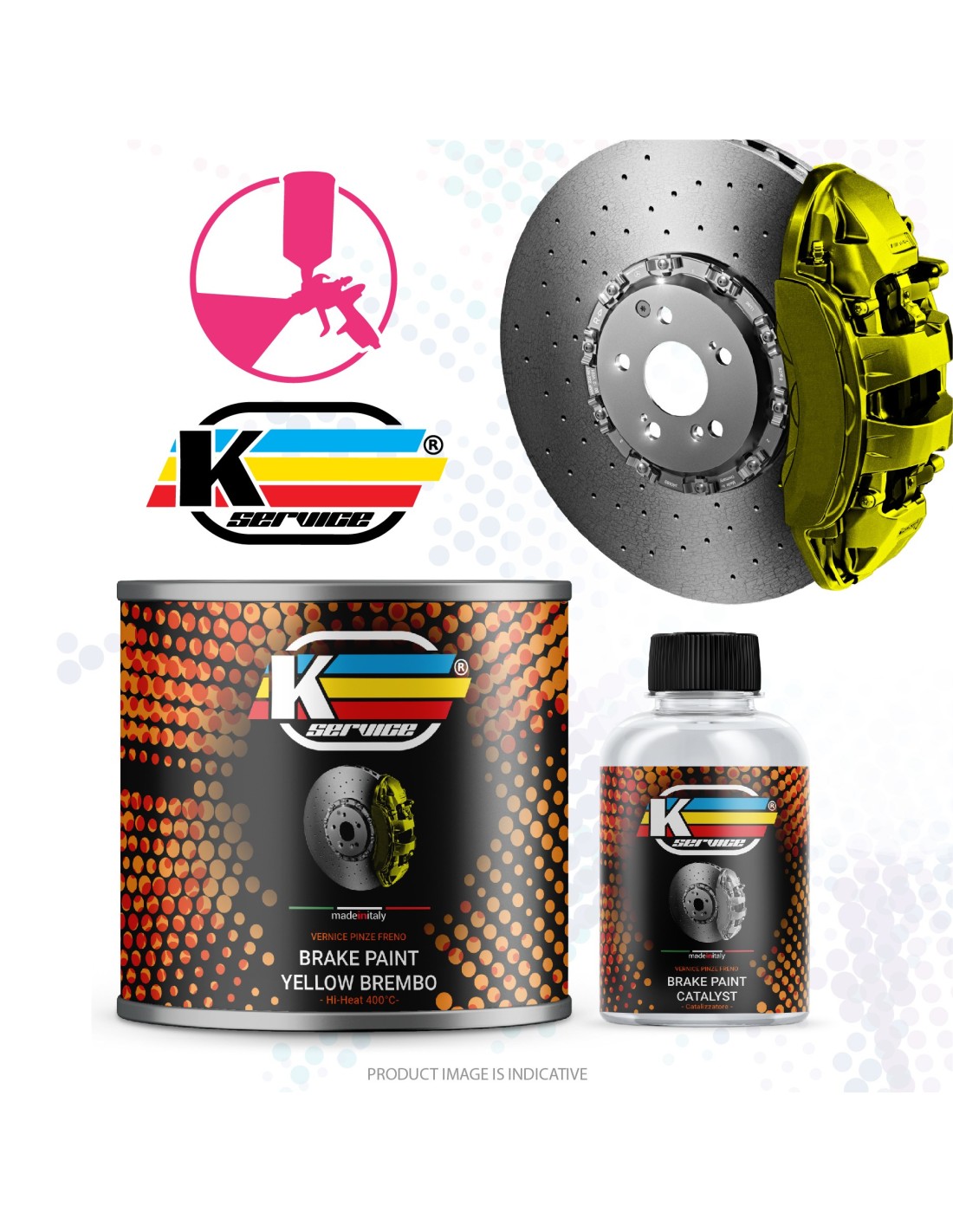 Vernice alta temperatura lucida bi componente per pinze freno giallo Modena valido anche per giallo Brembo, fornita in kit base più catalizzatore già predosati.